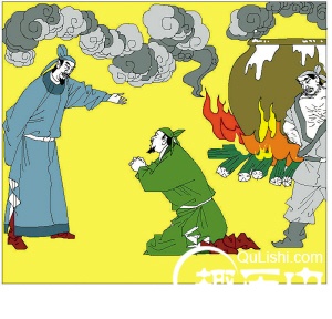 来俊臣听了,就叫公差去搬一只大瓮和一盆炭火到大厅里来,把瓮放在火盆上。盆里炭火熊熊,烤得整个厅堂的人禁不住流汗。