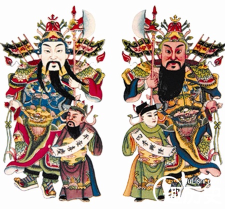 唐朝以后,除了以往的神荼、郁垒二将以外,人们又把秦叔宝和尉迟恭两位唐代武将当作门神。相传,唐太宗生病,听见门外鬼魅呼号,彻夜不得安宁。于是他让这两位将军手持武器立于门旁镇守,第二天夜里就再也没有鬼魅搔扰了。其后,唐太宗让人把这两位将军的形象画下来贴在门上,这一习俗开始在民间广为流传。